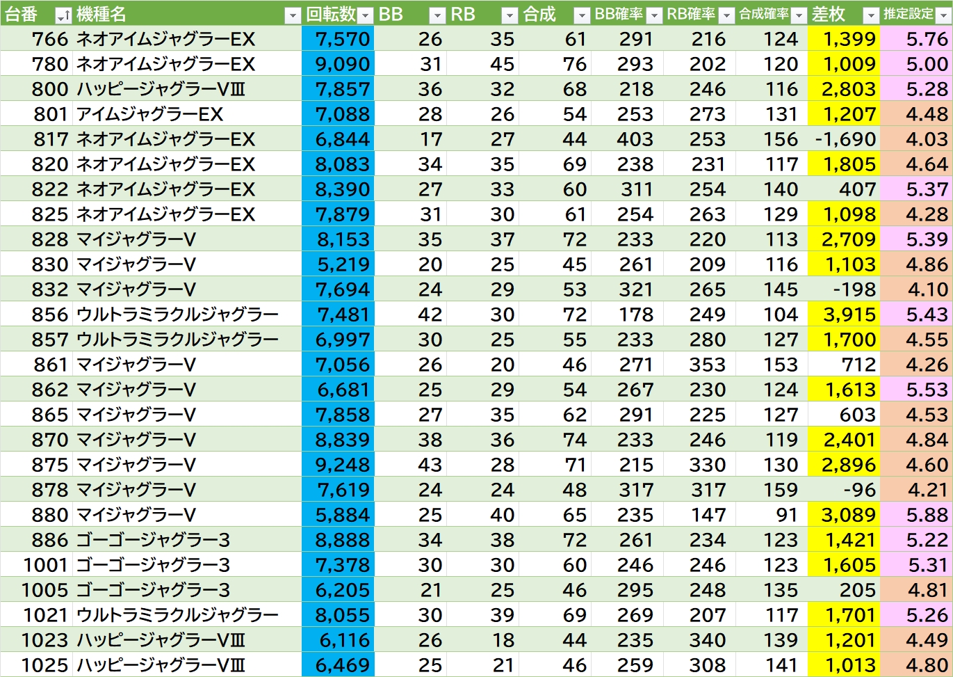 | ネオアイムジャグラーEX | 781 | 6,450 | -1,688 |