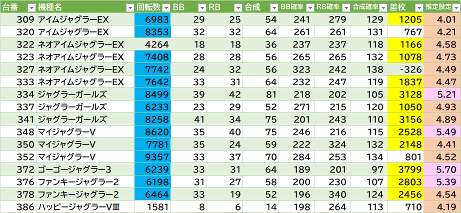 | ネオアイムジャグラーEX | 326 | 1,365 | 626 |
