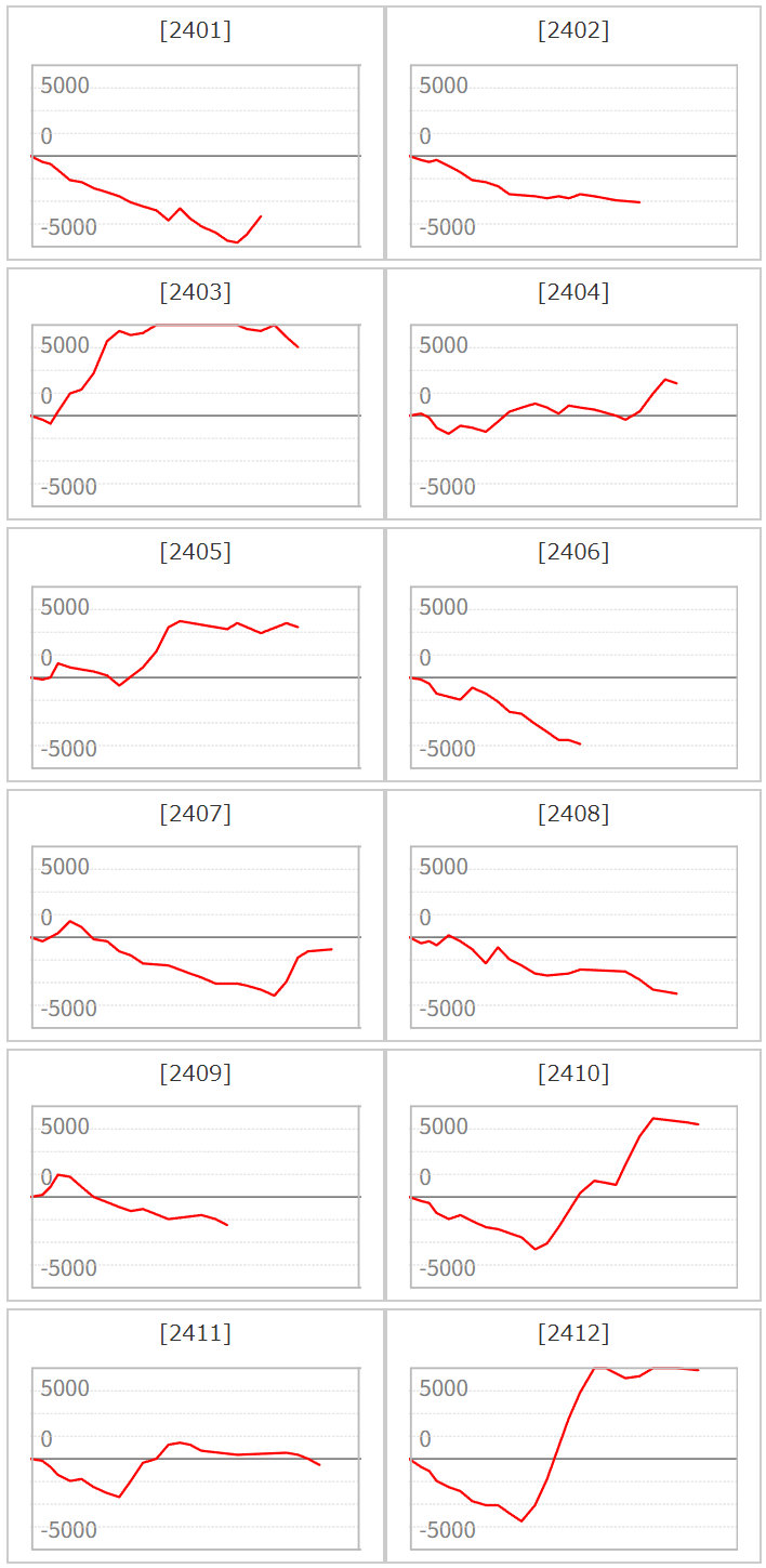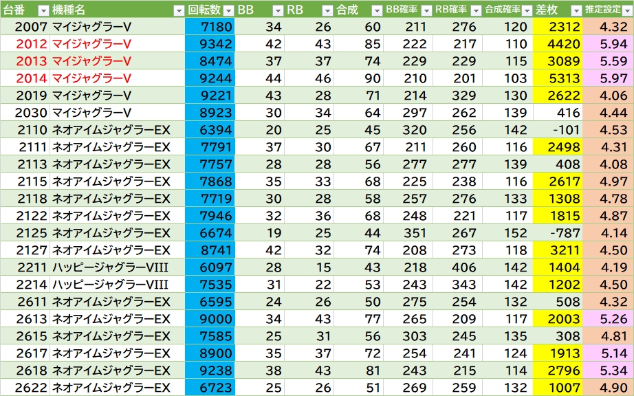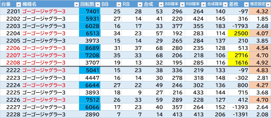 連番で気になる所あり▶①鉄拳6の2403~2405番。②L炎炎2の1135~1136番。③モンキーⅤの1202~1207番(1203番+10700枚🎉)。④L北斗の2503~2504・2517~2520番辺り。あとはライズ・ゴブスレⅡが1/3位〇。新鬼3は端側辺りに万枚over2台あり🎉ヴヴヴ2・かぐや様・チバリヨ2にも万枚over1台🎉ほかGE・ニューキンⅤなど。ジャグラーは133台中30台(22.6%)が推定4以上。ゴージャグ3が8/15台。マイⅤの2012~2014番・ネオアイムの2617~2618番が5以上の連番。