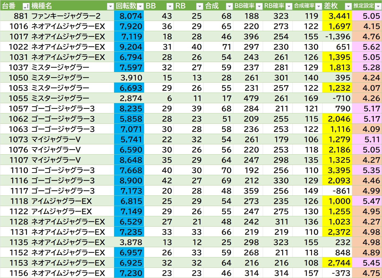 いざ番長・かぐや様が1/3位良さそう。転生2は1/4位〇。ヴヴヴ2・L北斗・沖ドキゴージャスに万枚over1台あり🎉ほか機種1で気になる所が多め。ジャグラーは98台中26台(26.5%)が推定4以上。