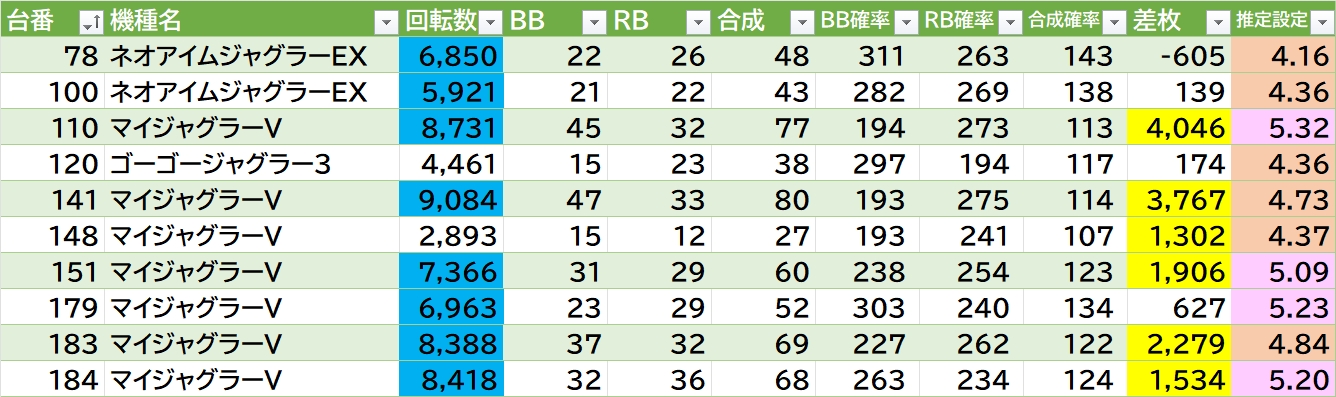 | ネオアイムジャグラーEX | 78 | 6,850 | -605 |