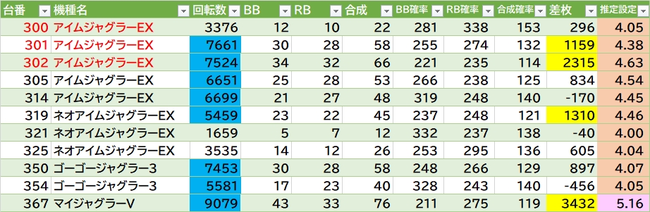 | アイムジャグラーEX | 303 | 3,550 | -420 |