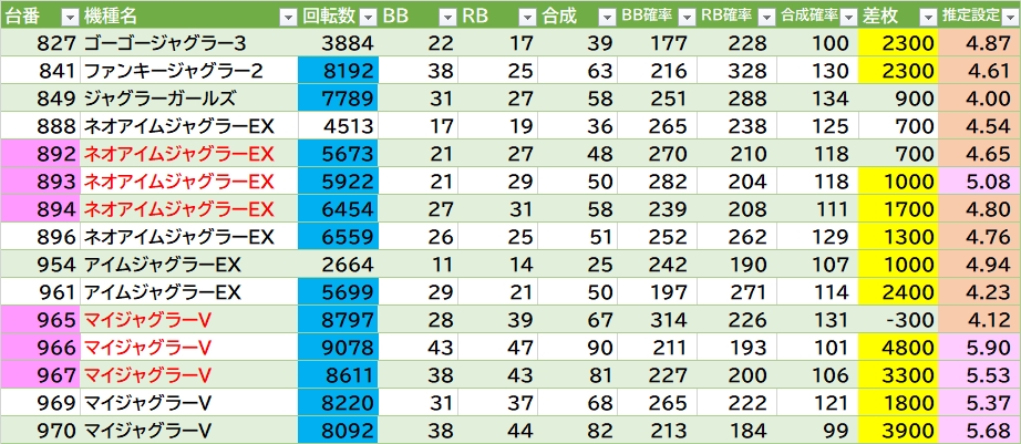 気になる2機種▶①新鬼3 平均5479G 勝率2/4台(隣のからサー跨ぎ辺りも〇)。②L化物語 平均3879G 勝率3/4台。あとは北斗シリーズが片列寄せな感じ(跨ぎ辺りの985~992番が〇)。ジャグラーは100台中15台(15%)が推定4以上。マイⅤの角965辺り良さそう(965~970番間が4/6台で5以上)。ネオアイムの892~896番辺りも〇。