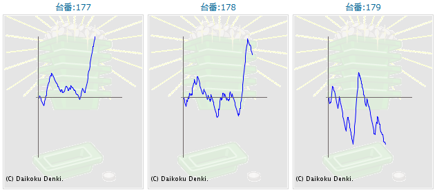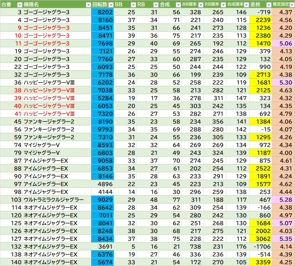 吉宗が勝率3/3台(平均5833G)で181番+16900枚🎉からサー・L北斗・モンキーⅤ・東リベは半分位〇(からサー・北斗は万枚over1台あり🎉)。転生2の249~250番・新鬼3の297~299番・ライズの278~280番辺りも〇。L炎炎2・L秘宝伝は2/3台気になる。いざ番長は両端台〇。ほかヴヴヴ2・沖ドキGOLDなど。ジャグラーは147台中33台(22.4%)が推定4以上。ゴー3の9~11番・ハッピーの38~41番の連番〇。