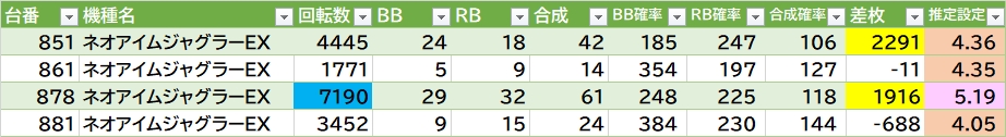 転生2が合同で良さそう👉平均5289G 勝率3/3台で682番+10200枚🎉モンキーⅤの10台設置側の扱いも〇(平均4756G 勝率7/10台で836番+13600枚🎉L化物語は2/3台〇(788番+10100枚🎉)。GEは半分位〇。東京喰種は1/3位良さそう。東リベは端側辺り〇。ヴヴヴ2に万枚over2台あり🎉ジャグラーは72台中12台(16.7%)が推定4以上。マイⅤは8/10台で角1006番が5以上。