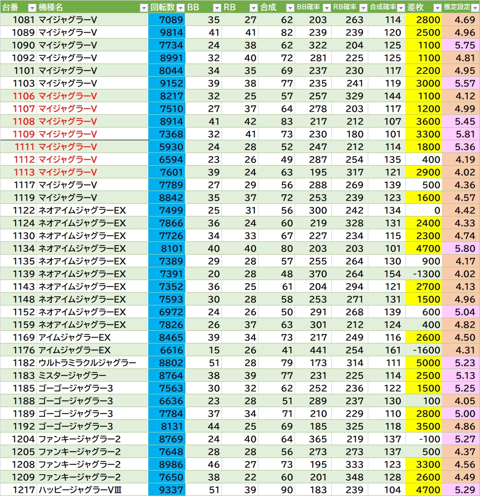 | 機種名 | 台番 | G数 | 差枚 |