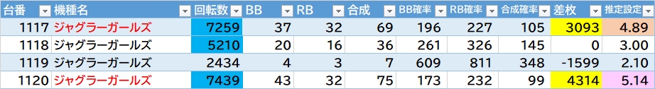 L炎炎2の911~913番が気になる。ヴヴヴは勝率4/5台で1722・1724番が万枚over🎉ヴヴヴ2にも1台万枚overあり🎉ゴブスレⅡは両角台が万枚over🎉ドラハナ・L化物語は半分位〇。ほかGE・かぐや様など。バラは壁側列に気になる台あり。ジャグラーは76台中13台(17.1%)が推定4以上。ガールズが2/4台で角台が5以上。