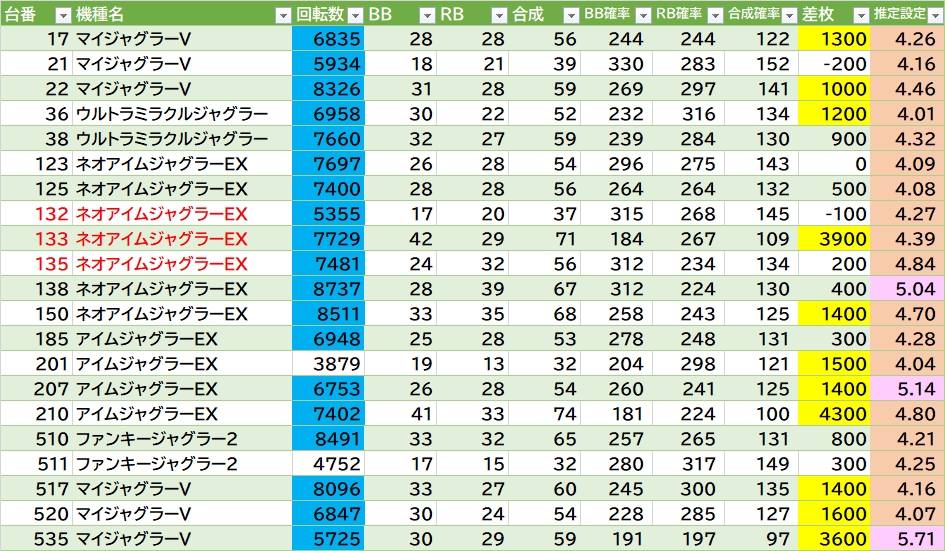 | マイジャグラーV | 17 | 6,835 | 1,300 |