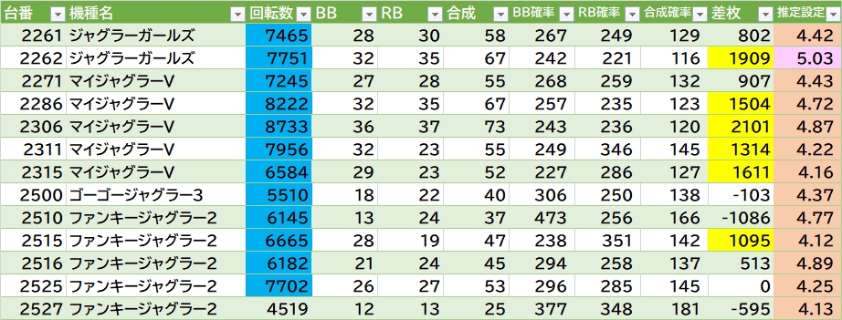 2台機種の不二子BT・マギレコ良さそう。転生2は2131~2132・2153~2156番の連番〇。東リベ・SBJの跨ぎ〇。L炎炎2は2608~2615番辺りが気になる。いざ番長・東京喰種・L北斗・新鬼3は1/3位〇。モンキーⅤは真ん中辺り悪くなさそう。ほかヴヴヴ2・ゴブスレⅡ・鉄拳6など。ジャグラーは137台中35台(25.5%)が推定4以上。ハッピーが3/5台で5以上。ネオアイムは1列設置側に連番あり。