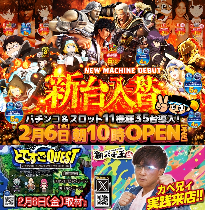 ベルエアMAX広川【新台入替&とてすごQUEST取材(×3)&カベ兄ィ来店】