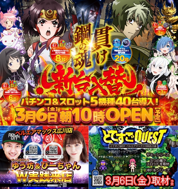 ベルエアMAX広川【新台入替&とてすごQUEST取材(×3)&ぴーちゃん・ゆう坊来店】