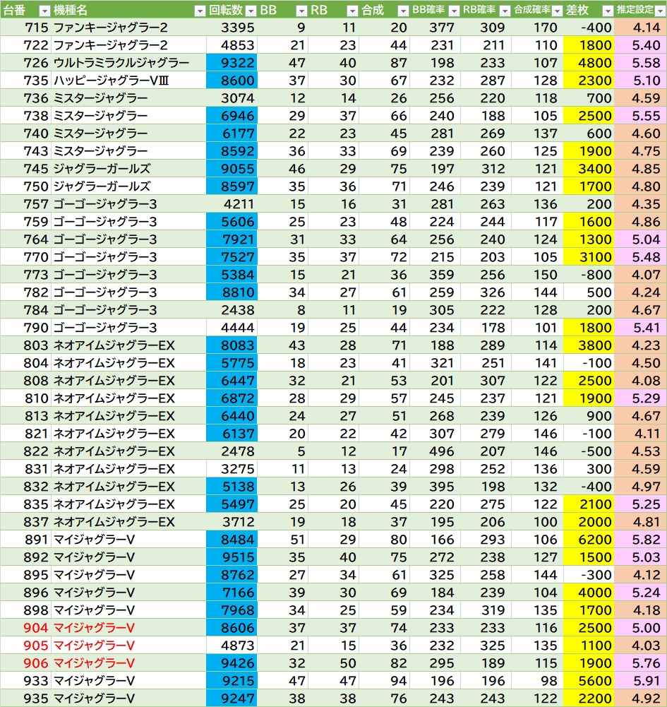 気になる所👉①L化物語 平均5161G 勝率4/5台。②海門決戦の535~540・545~547番辺り。あとは東京喰種が片側572~586番寄りな感じ。L炎炎2は1/3位〇。Lハナビは半分位悪くなさそう。ほか転生2・かぐや様など。ヴヴヴ・ヴヴヴ2・モンキーⅤに万枚over1台あり🎉ジャグラーは180台中40台(22.8%)が推定4以上。マイⅤの891~898・904~906番辺り〇。