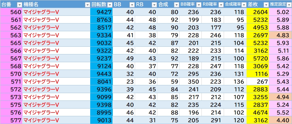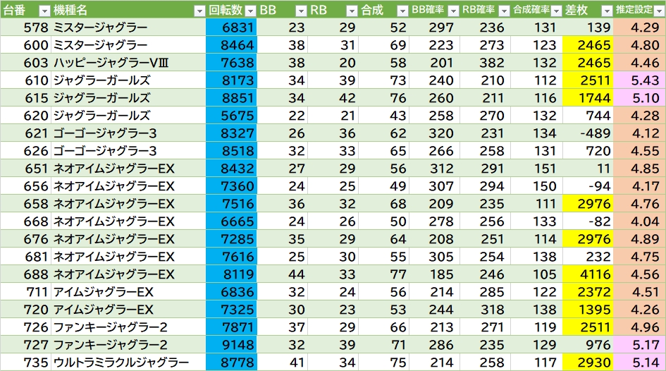マイⅤが良さげ👉平均9076G 平均+3391枚 推定4以上15/15台(100%)で内12台が5以上💮あとは2台機種の攻殻も気になる(平均5243G 勝率2/2台)。L秘宝伝は角522番良さそう。海門決戦・カバネリは半分位〇。沖DUOアンコールに万枚over2台あり🎉ほか東京喰種・モンキーⅤなど。ジャグラーは117台中35台(29.9%)が推定4以上。