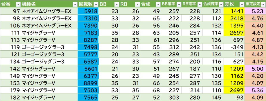 東京喰種は10台側の端側良さそう&1台側も〇。海門決戦は半分位気になる。モンキーⅤは242~247番辺り〇。ほか転生2・L化物語など。GEの275番+10700枚🎉ジャグラーは87台中13台(14.9%)が推定4以上。