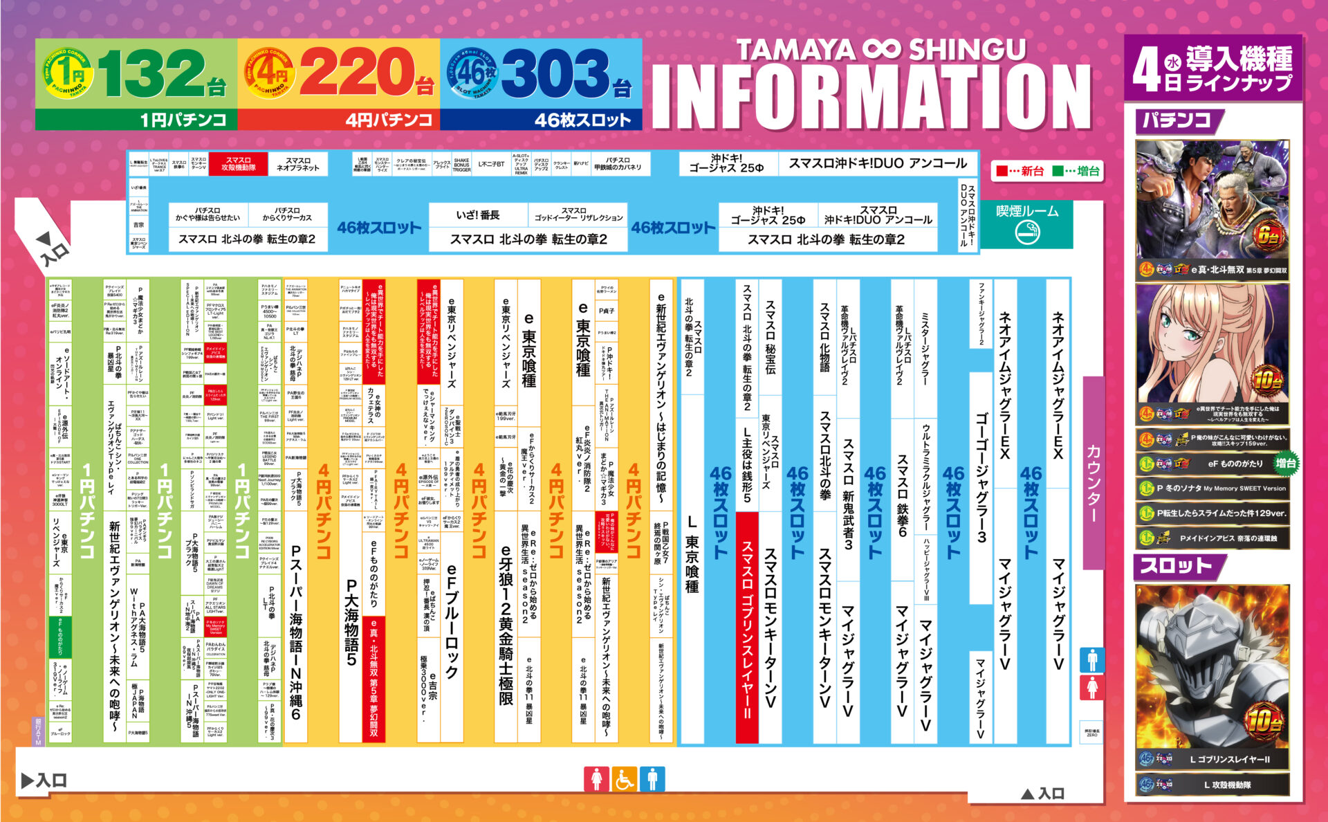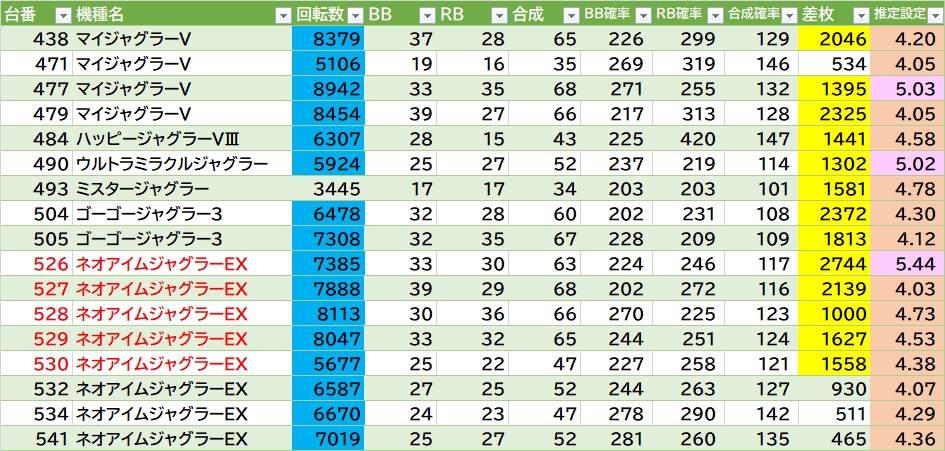 シリーズ新台導入直前のカバネリが扱い良さそう👉平均4864G 勝率3/3台。L化物語も気になる(平均5440G 勝率5/5台で418番+11100枚🎉)。GEは角側の3台が良さそう(614番+10400枚🎉)。東京喰種は1/3位悪くなさそうな感じ。転生2は639~648番側〇。ほか少数設置の554~582番側のアズレン・ToLOVEる8.7・不二子BTなど。ジャグラーは91台中17台(18.7%)が推定4以上。ネオアイムの526~530番〇。