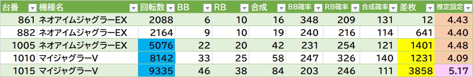 L化物語の扱いが良さそう👉平均5534G 勝率2/3台で787番+14000枚🎉L秘宝伝も気になる。ほか東京喰種・海門決戦・LBヱヴァなどに単品ありそう。ジャグラーは72台中9台(12.5%)が推定4以上。ゴージャグ3が4/5台。マイⅤの1015番も〇。