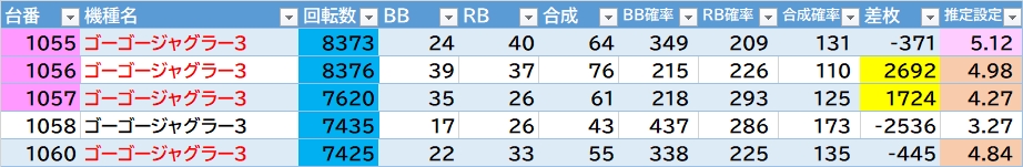 | 機種名 | 台番 | G数 | 差枚 |