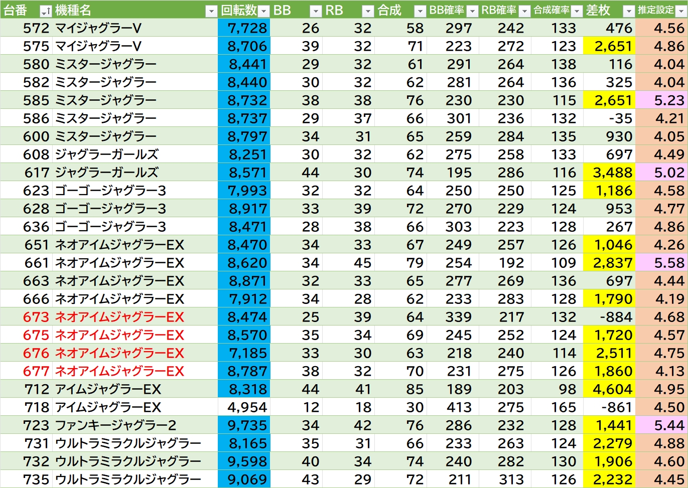 虚構推理が気になる👉平均9046G 勝率2/2台。あとはL炎炎2が2/3台良さそう(820番+11300枚🎉)。L化物語も2/3台悪くなさそうな感じ。海門決戦・転生2は半分位〇。L北斗は角辺り〇。ほか東京喰種・モンキーⅤ・ヴヴヴ2など。GE・L沖DUOアンコールに万枚over1台あり🎉ジャグラーは117台中26台(22.2%)が推定4以上。ネオアイムの673~677番・ミラクルの731~735番辺り〇。
