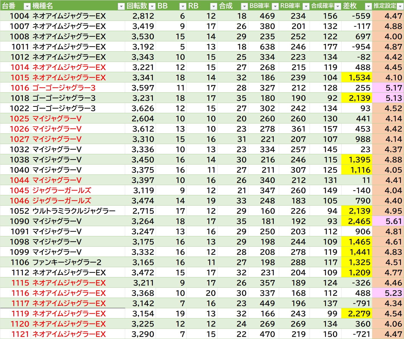 新台のゴッド軌跡👉平均2483G 勝率8/12台で1168・1171・1175番が万枚over🎉転生2は1/3位〇(1280番+10000枚🎉)。ほか気になる台があったのはライズ・海門決戦・モンキーⅤ・東京喰種など。ジャグラーは88台中37台(42.0%)が推定4以上。ミスターが3/3台で内2台が5以上👏ハッピーは2/3台。ゴージャグ3の1016~1018番辺り・マイⅤの1090番・ネオアイムの1116番に5以上あり。