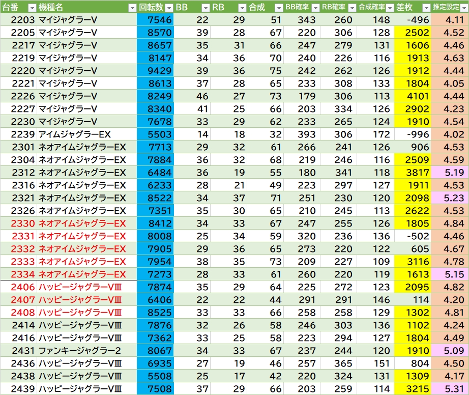 気になる所▶①ゴッド軌跡 平均7171G 勝率5/8台(837番+18500枚🎉)。②アズレン 平均5165G 勝率2/4台。③L炎炎2 平均6134G 勝率3/4台。④L化物語 平均5255G 勝率3/5台。あとはドラハナが4/5台合算〇(938番はREG重め)。東京喰種は真ん中辺りと1020番側の角付近〇。海門決戦は1137~1139番の連番〇(1137番+12700枚🎉)。真打吉宗は1台飛びで悪くなさそう。転生2の1103番+10500枚🎉ほかモンキーⅤ・Lハナビなど。ジャグラーは120台中30台(25%)が推定4以上。ネオアイムの2330~2334番/ハッピーの2436~2439番側〇。末尾【7】👉1台平均+2001枚 勝率17/32台(53.1%) ジャグ推定4以上3/12台(25%)。