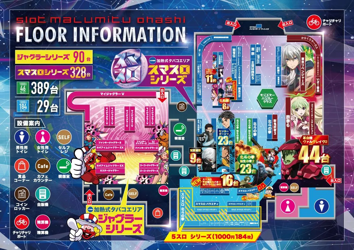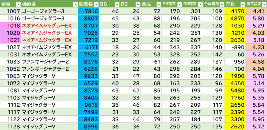 化物語・攻殻の列が気になる▶①L化物語 平均4516G 勝率5/6台。②攻殻 平均5131G 勝率4/5台。あとは海門決戦の587~602番側が良さそう&77~100番側も半分位〇。ヴヴヴ2の603~608番側も気になる。東京喰種は半分位〇。L炎炎2は1/3位。ジャグラーは90台中17台(18.9%)が推定4以上。ネオアイムの1018~1021番良さそう。マイⅤは8/50台で5以上のみ。