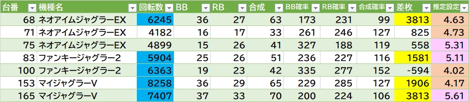 | 機種名 | 台番 | G数 | 差枚 |
