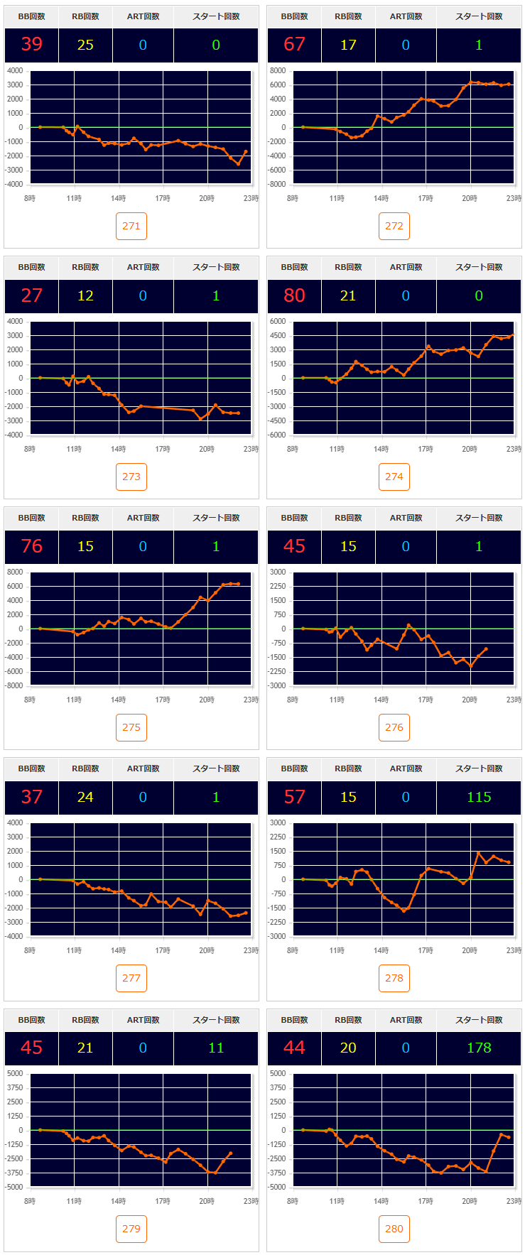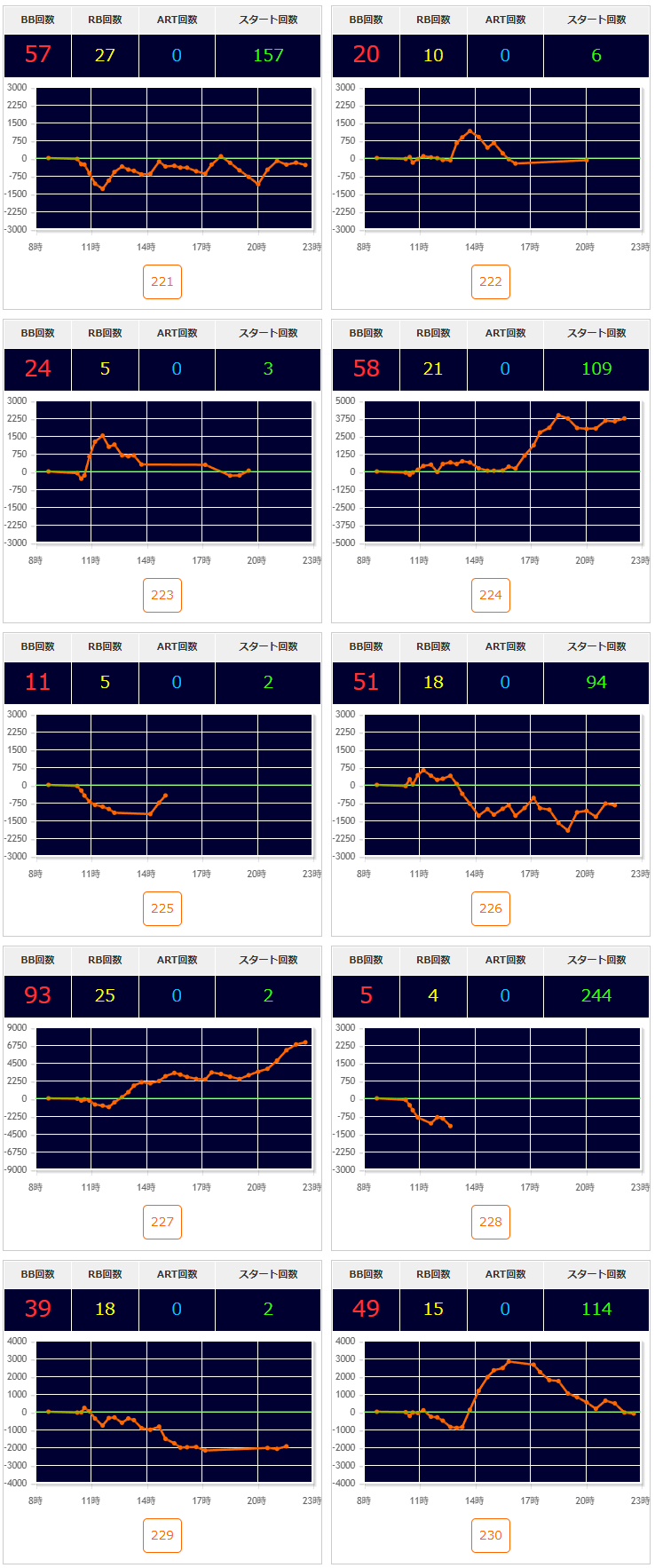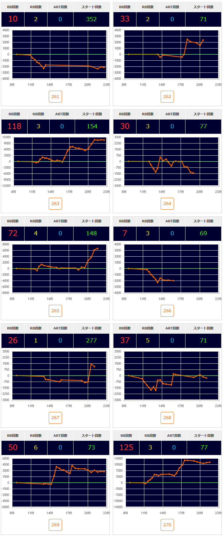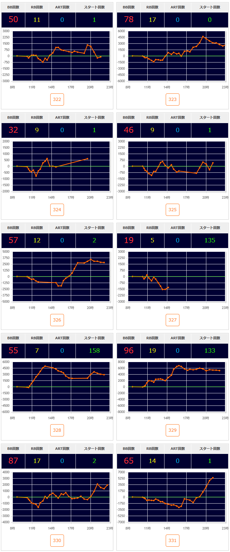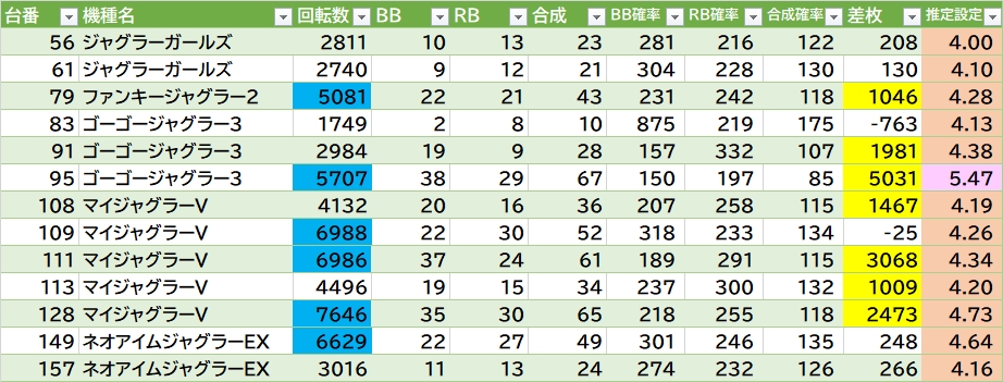 GEは329~331番の連番が良さそう。モンキーⅤは1/3位〇。SBJは1/2台で万枚overあり🎉1台機種のハイパラ〇。あとは海門決戦の272~275番辺り気になる。ヴヴヴ2に万枚over2台🎉。ジャグラーは136台中13台(9.6%)が推定4以上。