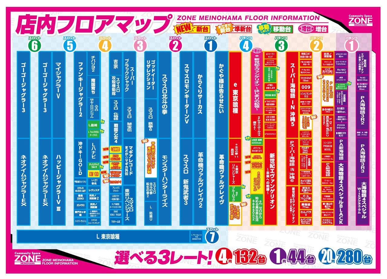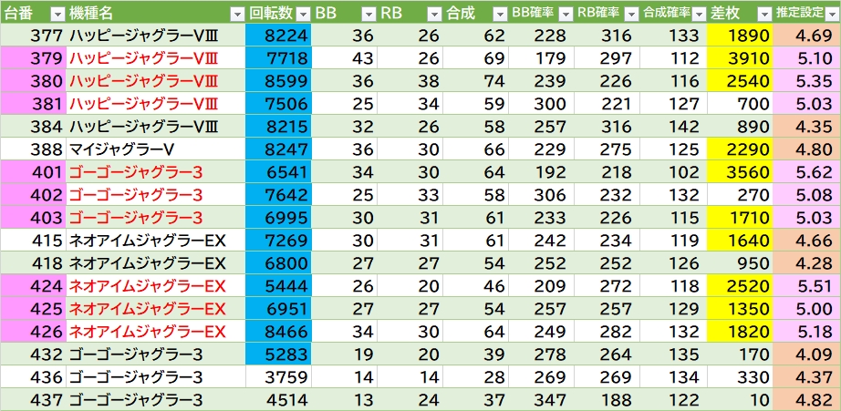 L北斗は256~257番の連番良さそう。モンキーⅤ・新鬼3の列は角辺り〇。ヴヴヴ2・海門決戦・島娘(1台機種)に万枚overあり🎉新台4機種は各1台導入で気になったのはいせかる。ジャグラーは77台中17台(22.1%)が推定4以上。ハッピー・ゴージャグ3・ネオアイムに5以上の3台連番あり👏