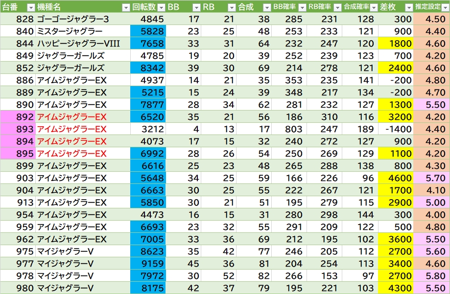 スマスロ北斗は992~997番の連番良さげ👏モンキーⅤは938~944番辺り〇。からサー・かぐや様の跨ぎも気になる。新台🆕▶①いざ番長は平均5434G 勝率2/3台で922番良さそう。②ギルクラ2は平均5238G 勝率1/3台。③DMC5 STYLISH TRIBEは平均5687G 勝率0/4台。④パルサーBTは平均5654G 勝率0/2台。⑤ULTRAMANは4646G -2000枚。ジャグラーは100台中23台(23%)が推定4以上。マイⅤの975~980番辺り・アイムの889~895番辺りに推定4以上かたまってる。